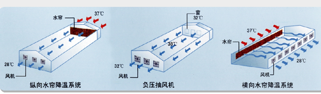 濕簾降溫系統(tǒng):水流在水泵的作用下通過噴淋管道進(jìn)入波紋狀的纖維紙表面,從而形成水簾,當(dāng)室外干熱空氣在風(fēng)機(jī)的作用下穿過水簾時(shí),空氣中的熱量將被流動(dòng)的水流帶走蒸發(fā),從而達(dá)到降溫的目的。