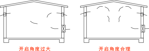▲靠近風(fēng)機(jī)的側(cè)風(fēng)窗開(kāi)啟角度較小,遠(yuǎn)離風(fēng)機(jī)的側(cè)風(fēng)窗開(kāi)啟角度較大,確保風(fēng)量均勻;